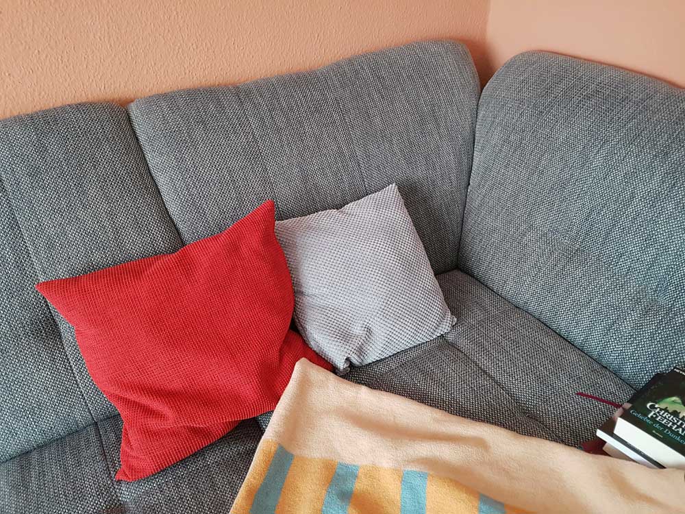Denn man will sich ja auch irgendwo gemütlich ausstrecken können. Ich mache das am Liebsten auf der Wohnzimmercouch, wo ich es mir dann mit Kissen und Decke gemütlich mache. Ich kann mich gemütlich anlehnen und in meine Decke einmummeln!